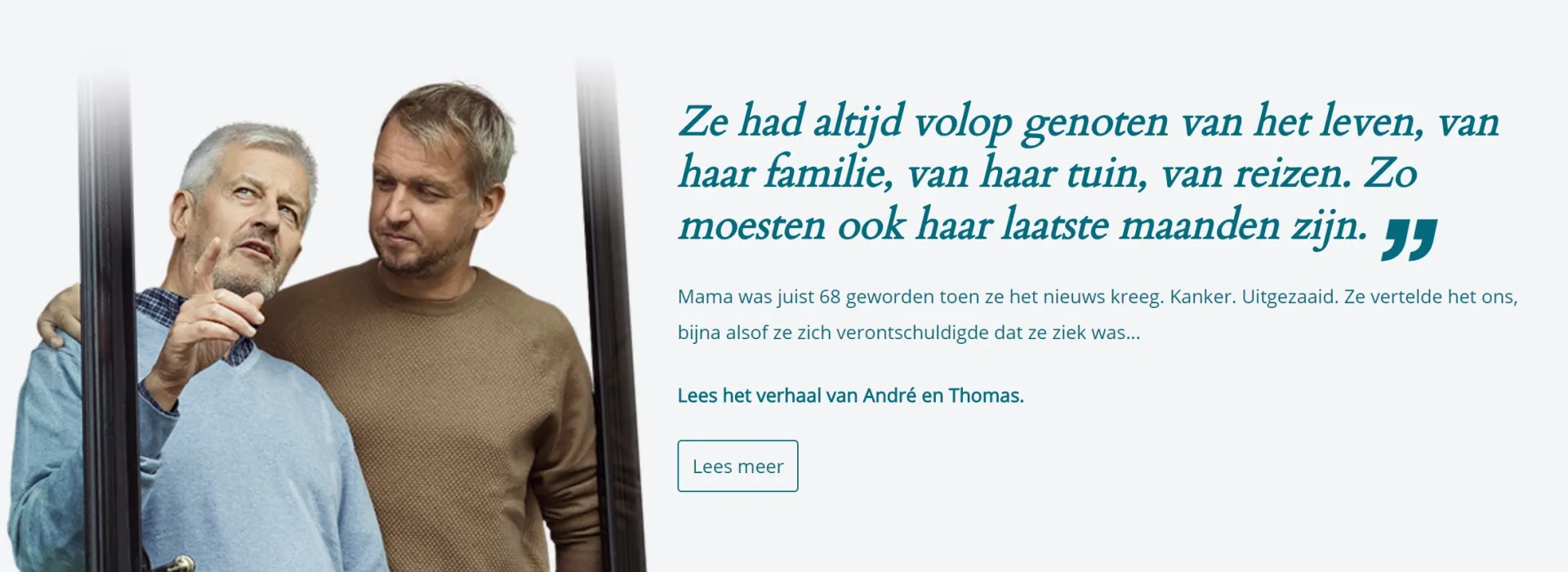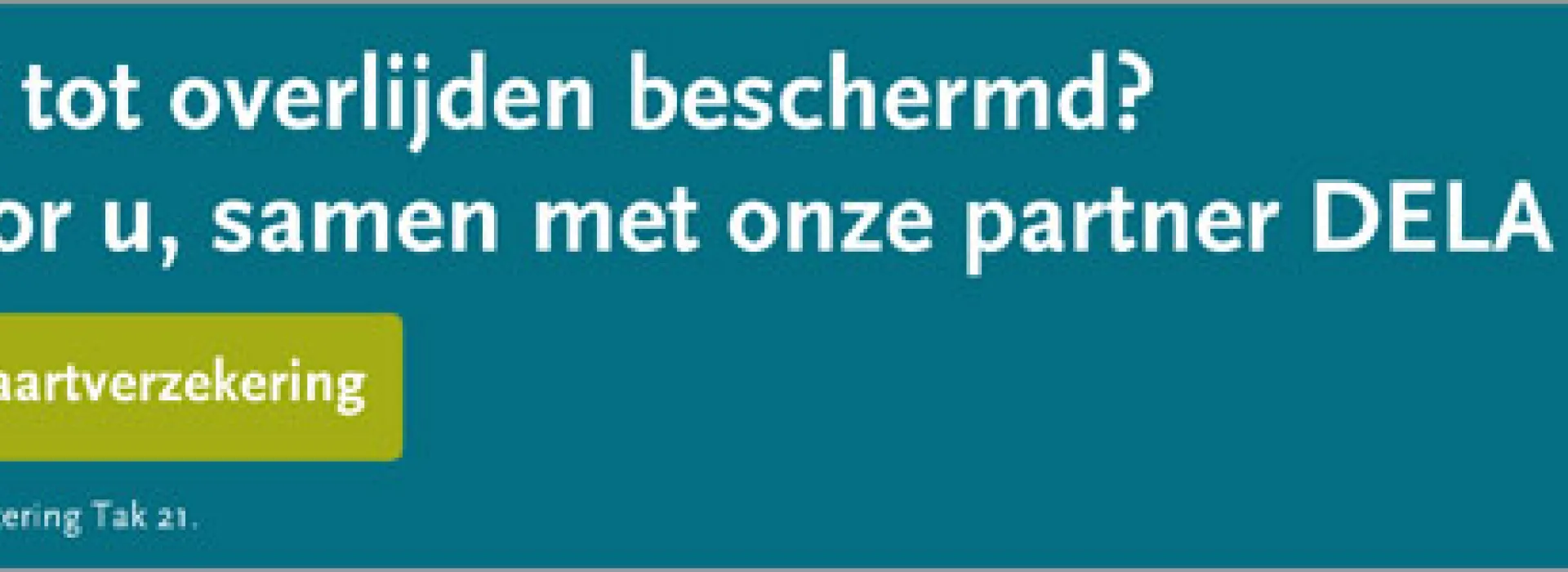 DELA Natura- enlevensverzekeringen N.V. – Belgisch bijkantoor (ondernemingsnr. 0665.931.229) gelegen te Noorderplaats 5 bus 2 te 2000 Antwerpen, bijkantoor van DELA Natura- en levensverzekeringen N.V., vennootschap naar NL recht (KvK-nummer 17078393), gelegen te Oude Stadsgracht 1, 5611DD Eindhoven, NL, toegelaten voor Tak 21 levensverzekeringen onder codenr. 2864; fabrikant DELA Uitvaartzorgplan, levensverzekering Tak 21 onderworpen aan BE recht - dekt levenslang uw uitvaartkosten voor het bedrag waarvoor u verzekerd bent. Offerte en premieberekening: www.dela.be en/of uw makelaar. Klachten: contact@dela.be of Ombudsman Verzekeringen (de Meeûsplantsoen 35, 1000 Brussel). In het eerste jaar is zelfmoord niet gedekt. Aan deze tekst kunnen geen rechten worden ontleend. Enkel de Algemene en Bijzondere Voorwaarden zijn bindend.